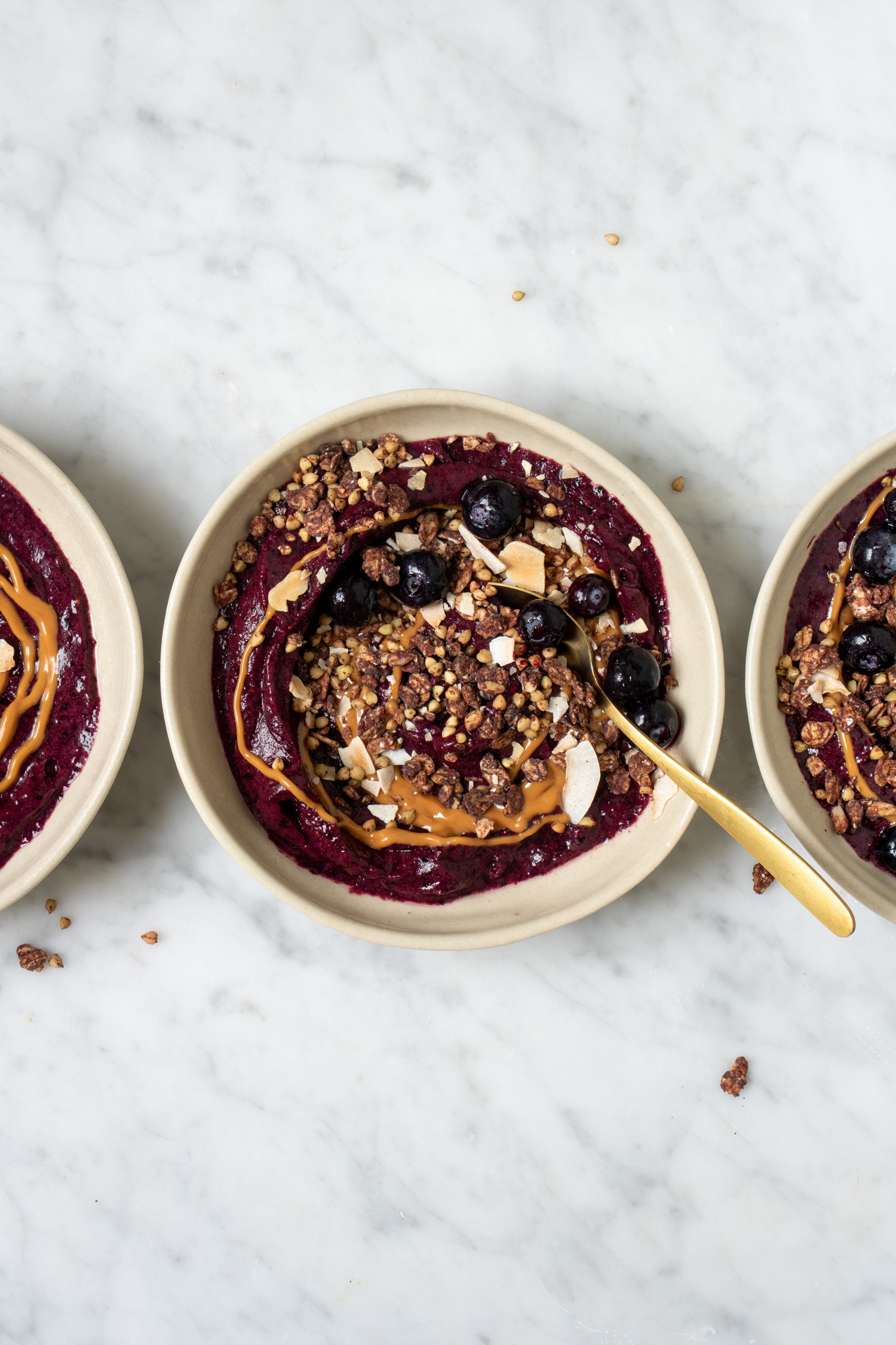 Mijn favoriete ontbijtje in de zomer is dit blauwe bessen bananenijs. Maar ook in de winter eet ik dit een keer of twee per week. Je pureert een banaan met een goede hoeveelheid blauwe bessen en je krijgt heerlijk ijs. Aftoppen met wat granola en pindakaas en het lijkt net alsof je een toetje als ontbijt hebt!