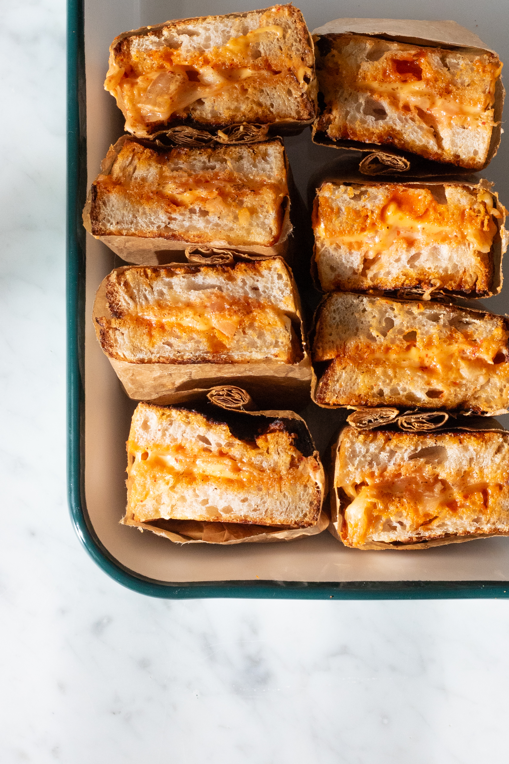 - Plaats een plakje cheddar op de kimchi en dek af met de overige sneeën brood, met de besmeerde kant naar binnen.