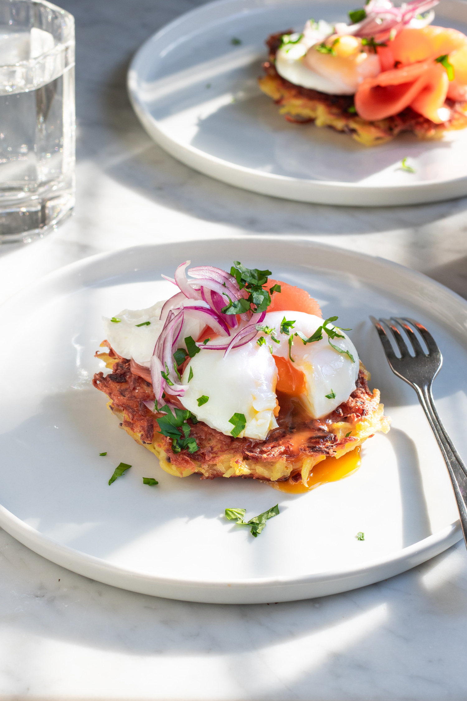- Plaats een latke op elk bord, leg er de gerookte zalm op, en dan een gepocheerd ei. Garneer met dille en serveer eventueel met zure room of crème fraîche.