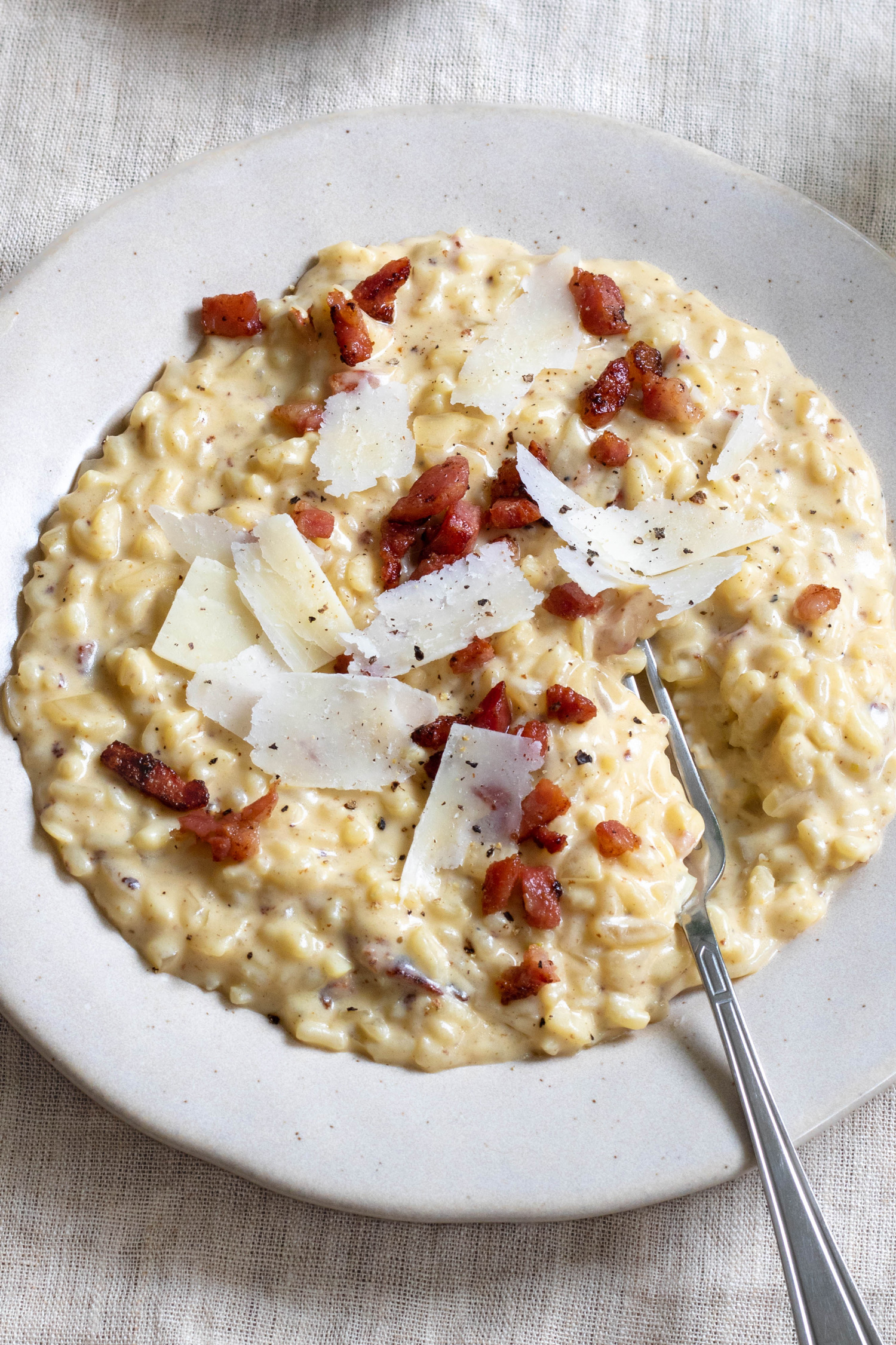 - Serveren: Serveer de risotto carbonara direct, eventueel met extra geraspte Parmezaanse kaas en een draai zwarte peper.