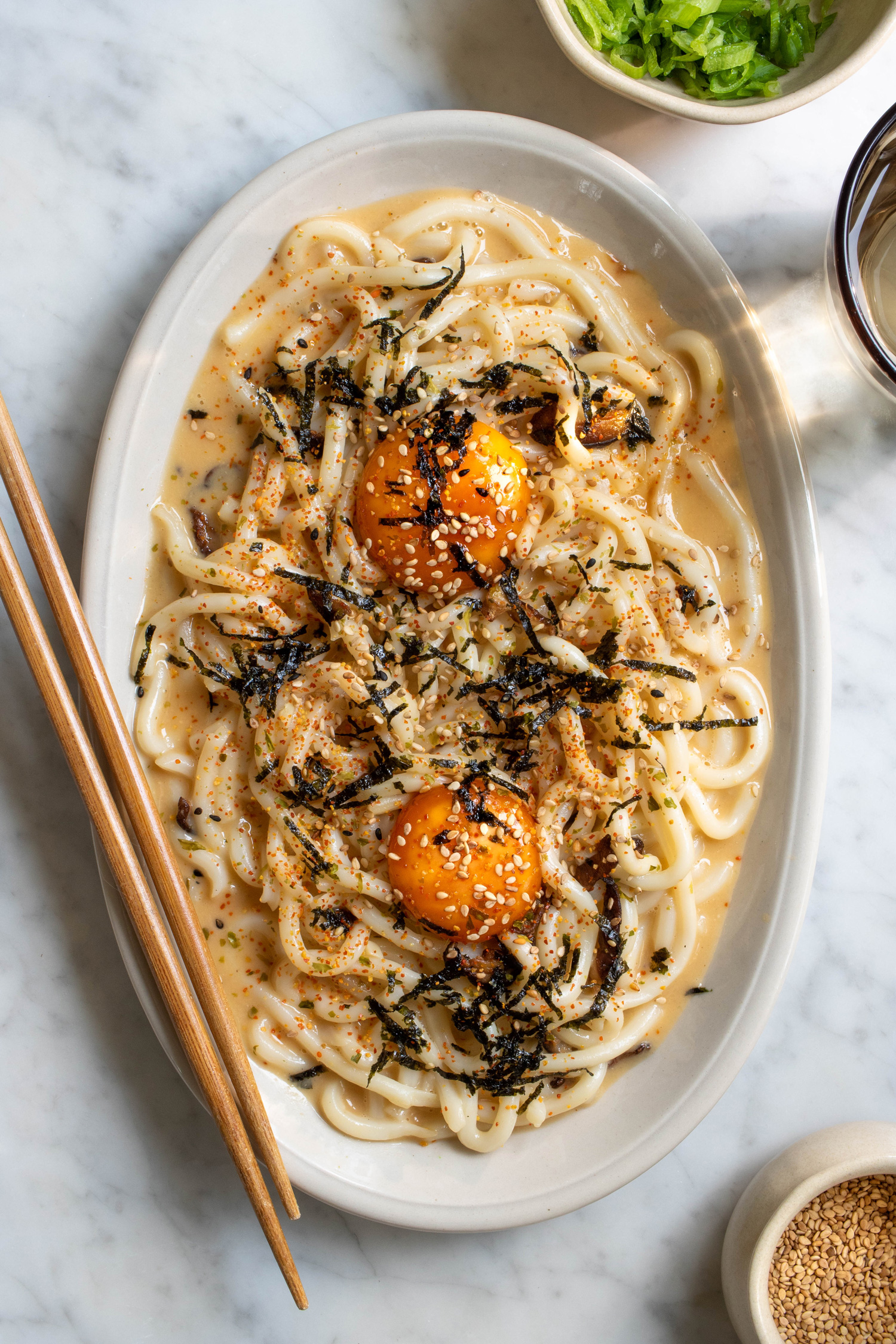 - Serveer de udon carbonara met fijngesneden nori, sesamzaadjes, en een snufje S&B Chili Peper. Leg bovenop elke portie een ingelegde eidooier voor een extra smaakdimensie.